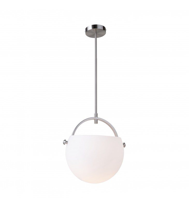Single pendant with a three quarter sphere shaped opal glassware on satin nickel metal arc frames.