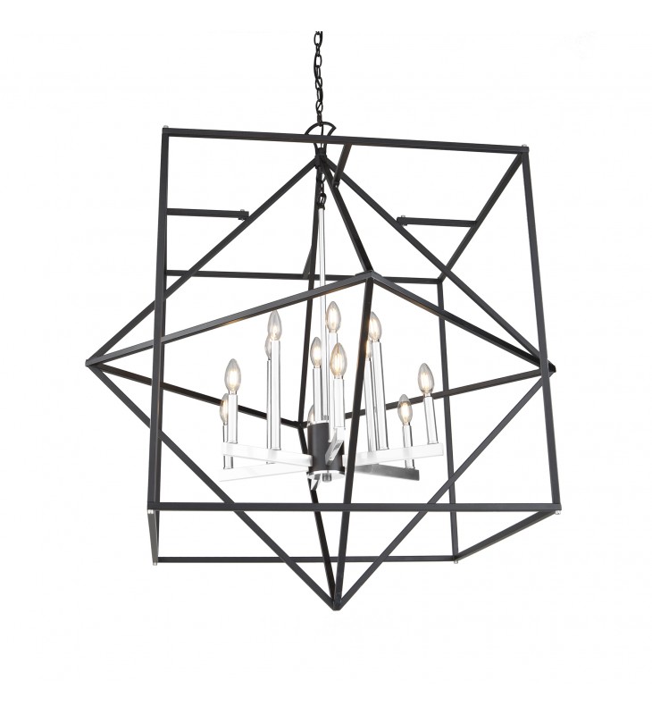 Linear in design, the Roxton collection is comprised of a matte black exterior cage which a diamond within a square that encases a polished nickel inner chandelier cluster. 12 light foyer chandelier (available with harvest brass interior as well)