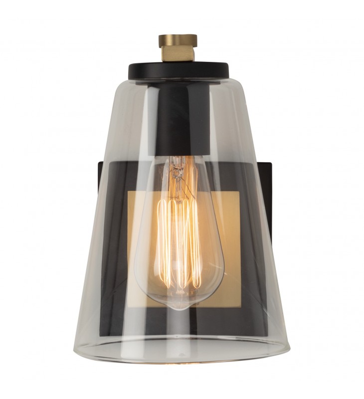 The Treviso collection by designer Kevin Kraemer is a perfect addition to any vanity area. This series features clear cone shaped glassware and is complimented with a black frame and brass accents. It almost appears at the holder has the bulb floating within. Single scone shown but also available in a 3 or 4 light.