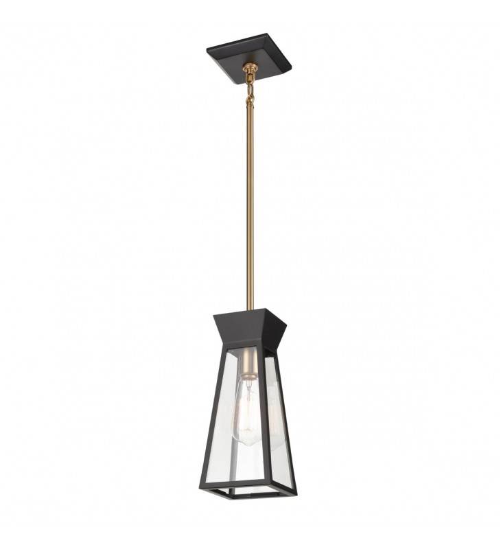 The Lucian collection, designed by Kevin Kraemer, is a modern twist on a classical lantern style light. Shown in a black with brushed brass accents (also available in a plated brushed brass finsh). Clear panel glassware surrounding the bulb. The model shown is a single pendant which comes with extra rods for easy height adjustment and has a hangstraight to be compatible with sloped ceilings.