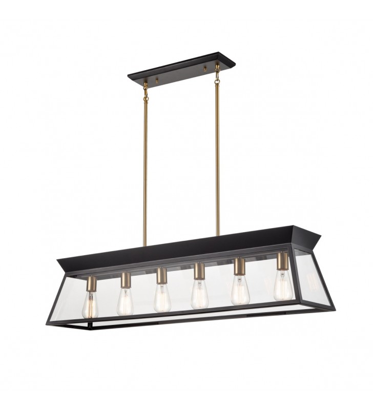 The Lucian collection, designed by Kevin Kraemer, is a modern twist on a classical lantern style light. Shown in black with brass accents (also available in a rich plated brushed brass). Clear panel glassware surrounding the bulbs. The model shown is a linear island chandelier which comes with extra rods for easy height adjustment and has a hangstraight to be compatible with sloped ceilings. Great for any table or island area.