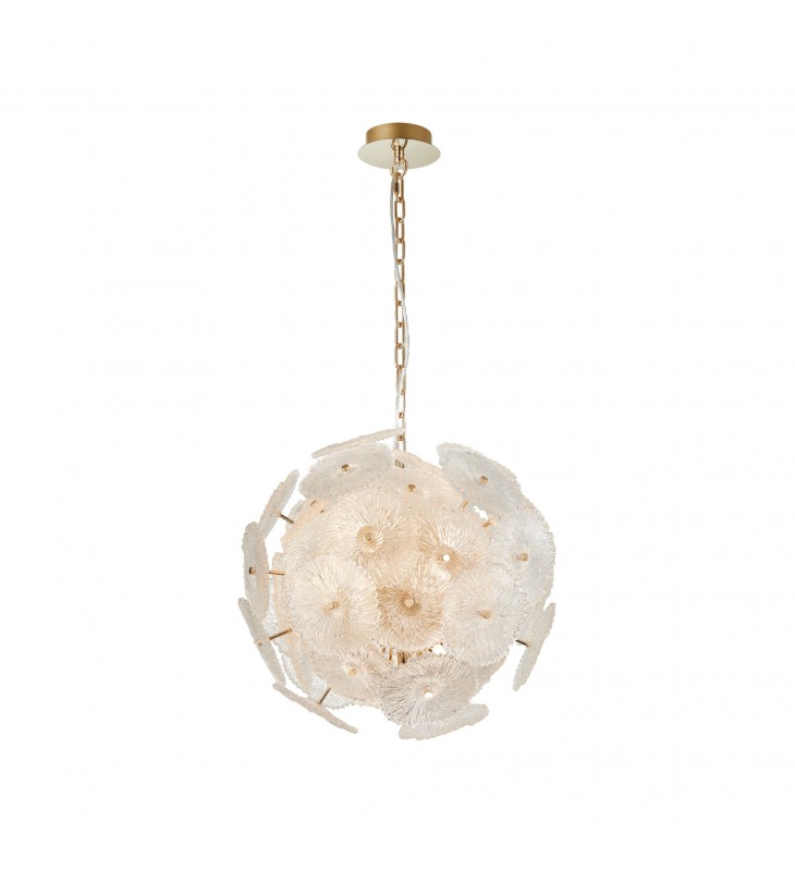 The defining feature of the Bloom collection lies in its enchanting glassware, meticulously crafted to resemble delicate and intricate flowers. The combination of the lustrous brass metal work and the floral-inspired glass elements makes this collection a captivating focal point for any space. The 18 light 19.5\" diameter circular chandelier is shown. (height adjustable via chain)