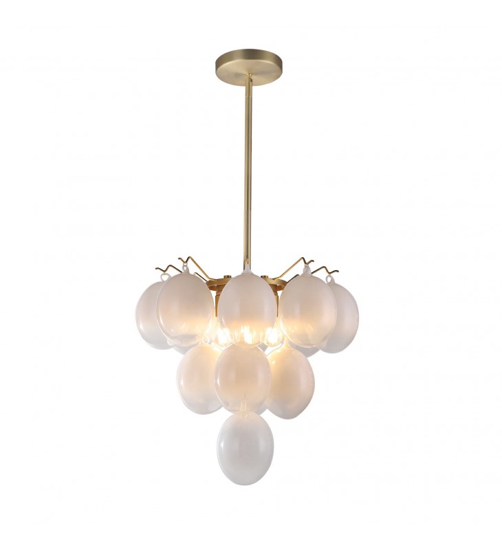 The Globo collection is characterized by its captivating milky white floating bubble-type glassware, creating a mesmerizing and elegant visual effect. This unique glassware is compliment with brushed brass framing giving it a sense of warmth. With its harmonious blend of luminous aesthetics and refined materials, the Globo collection offers a distinctive and luxurious lighting solution for any space. 5 lite 3 tier chandelier shown. (height adjustable with included rods)