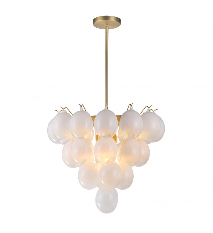 The Globo collection is characterized by its captivating milky white floating bubble-type glassware, creating a mesmerizing and elegant visual effect. This unique glassware is compliment with brushed brass framing giving it a sense of warmth. With its harmonious blend of luminous aesthetics and refined materials, the Globo collection offers a distinctive and luxurious lighting solution for any space. 9 lite 4 tier chandelier shown. (height adjustable with included rods)