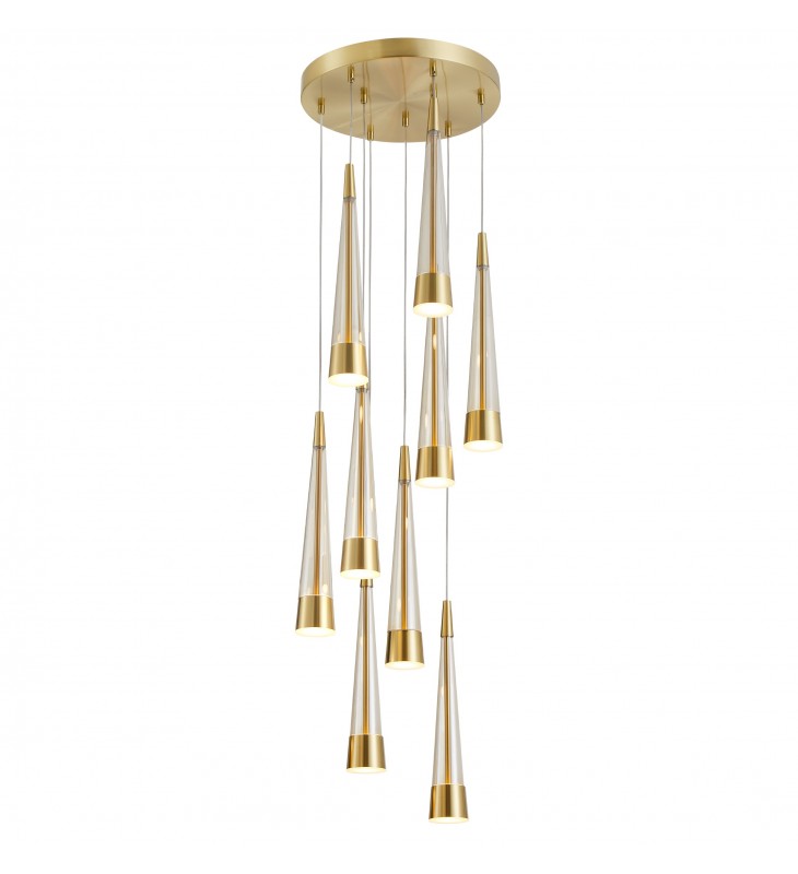 The Sunnyvale collection boasts a distinctive cone-shaped design adorned with metalwork on both the top and bottom, enveloping a captivating tea stain tinted center glass complimented with brushed brass framing. The pendant\'s exquisite craftsmanship and attention to detail result in a contemporary yet elegant aesthetic, making it a standout piece in any interior. With LED illumination seamlessly integrated throughout the glassware, the Sunnyvale collection not only delivers striking visual appeal but also provides efficient and ambient lighting. 9 light foyer model shown. (easily height adjustable)