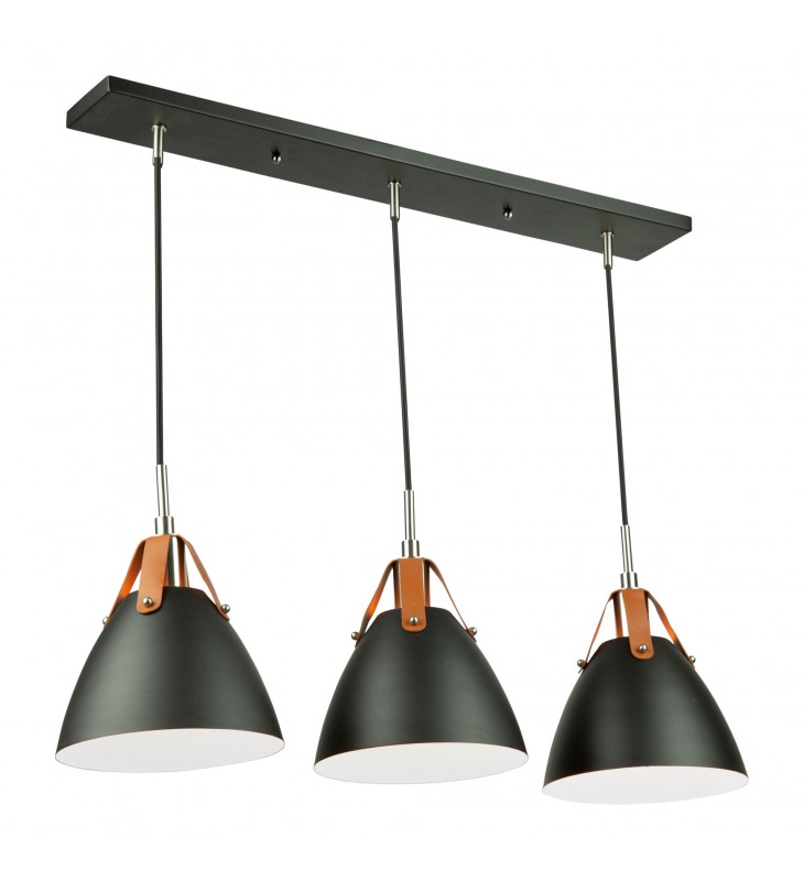 From designer Steven Sabados of S&C, the Tote collection is a definite fashion trend for your home or office d??cor. The matte black metal shades are suspended to the wiring with leather straps. The interior of the shades have a super reflective white finish for maximum light functionality. Two finishing touches for this design are the polished nickel accents, and the textile black wiring coverings.