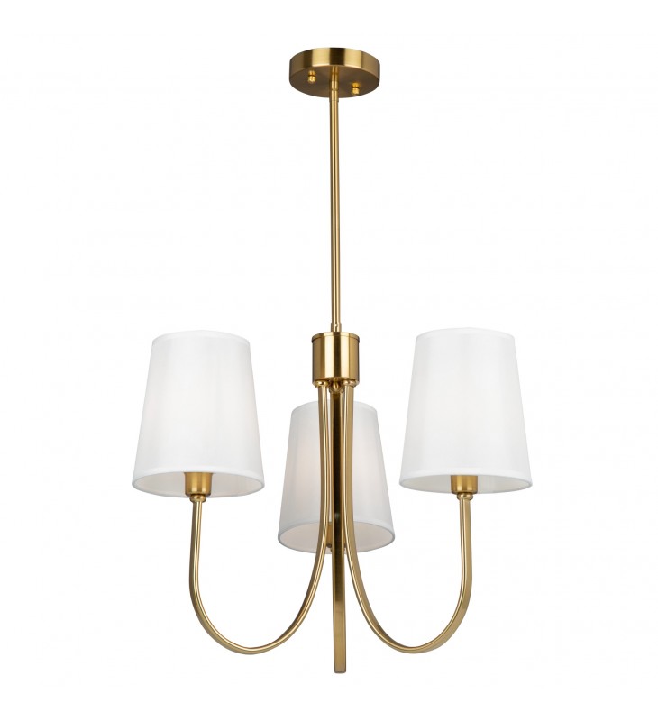 From the S&C design firm, with strict direction from Steven Sabados, the Rhythm Collection chandelier features a traditional type frame with flat tubular arms. The frame is finished in rich plated brushed gold and complimented with linen hardback white shades. \n