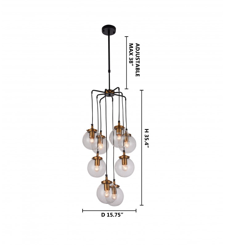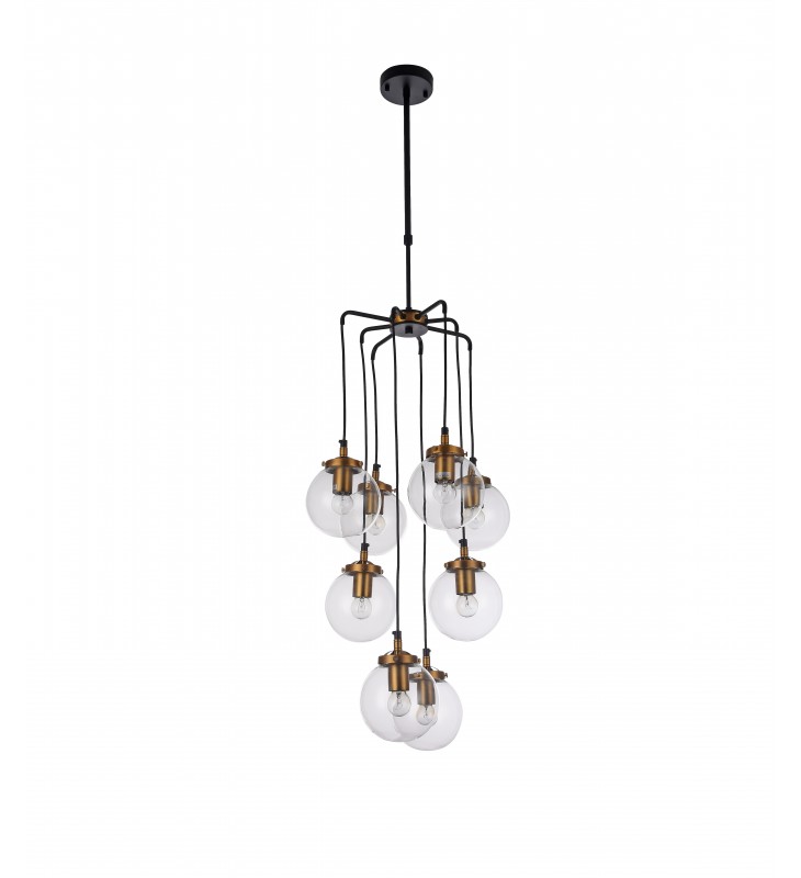 This exquisite fixture is in a black finish with eight glass shade in clear color. The socket and hardware are brass. It can be used in any room and provide better illumination.