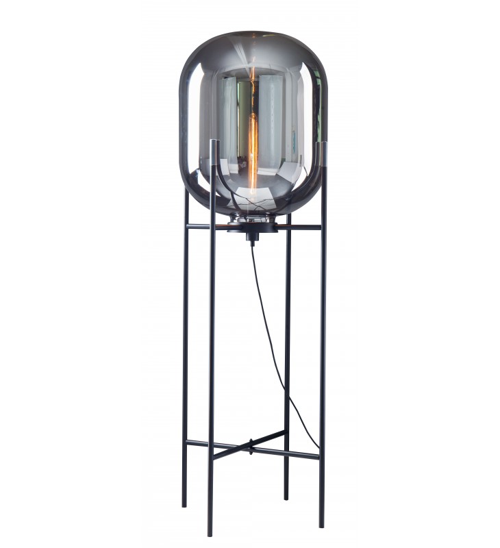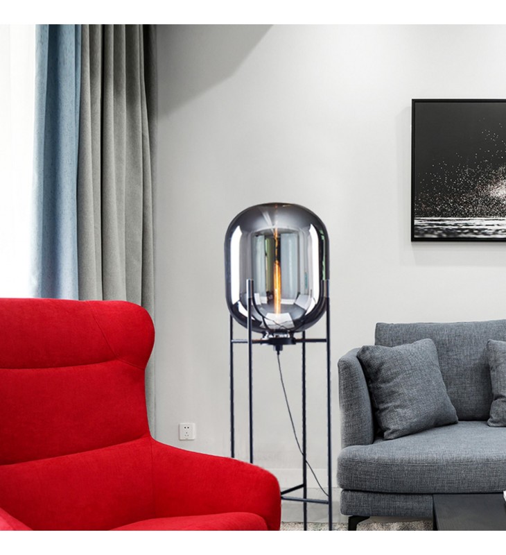 This modern floor lamp is in a matte black finish. The frame is made out of metal, and it comes with a glass shade in smoke color. It also comes with an ON/OFF switch. This floor lamp is great for chair side reading and general rooms illumination.