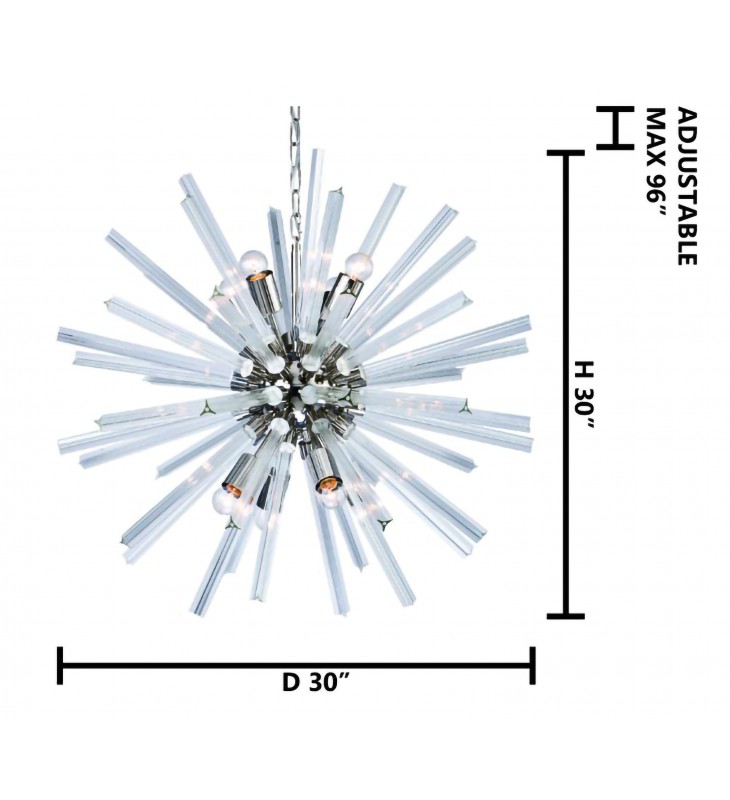 The center of this spike chandelier is made out of metal in a chrome finish. The clear glass decorations and bulbs (sold separately) are around of the center. This fixture is ideal in any room, entryways, and more.
