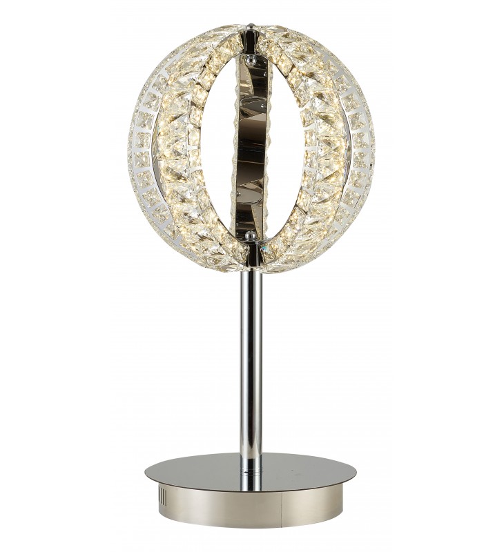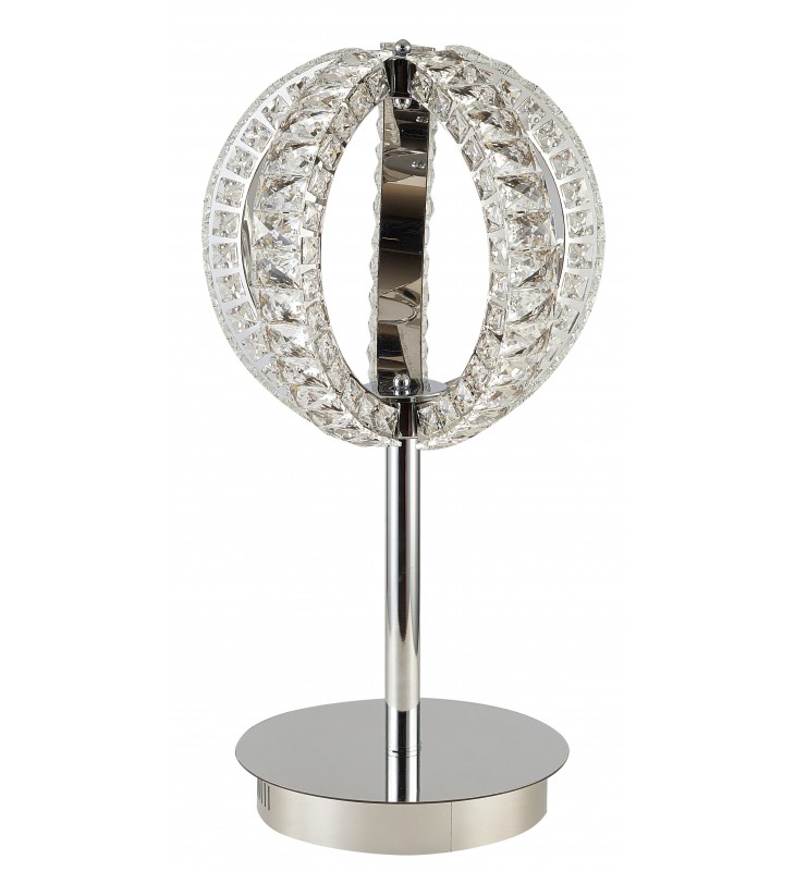 This exquisite dimmable LED table lamp is in a chrome finish. The base is made out of metal, and it comes with a metal frame in an ORB shape with clear crystal accents. The LED bulbs are integrated into the frame.