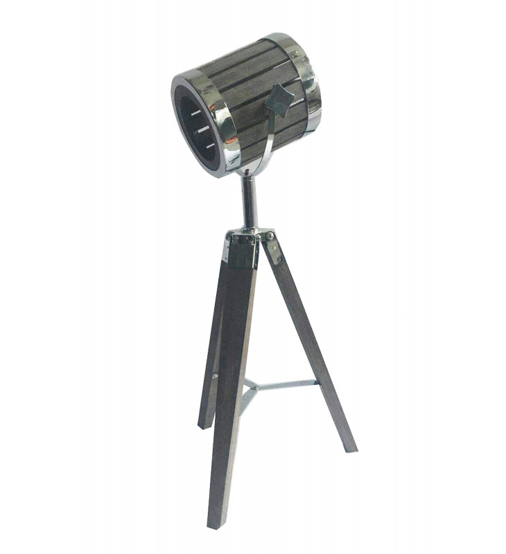 - This table lamp has a chrome metal frame with wood tripod legs.