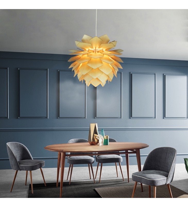This exquisite ceiling fixture is in a natural wood finish. The frame is made out of wood. The shape of this fixture likes an artichoke. Install a pair of pendants in your entryway, or three over your kitchen island to create a cohesive look