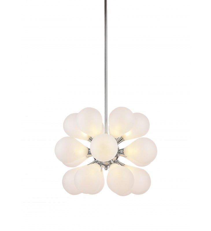The modern ceiling fixture is in a chrome finish. The frame of this fixture is made out of iron and likes a sputnik fixture. It comes with glass tear drop shades in white color.