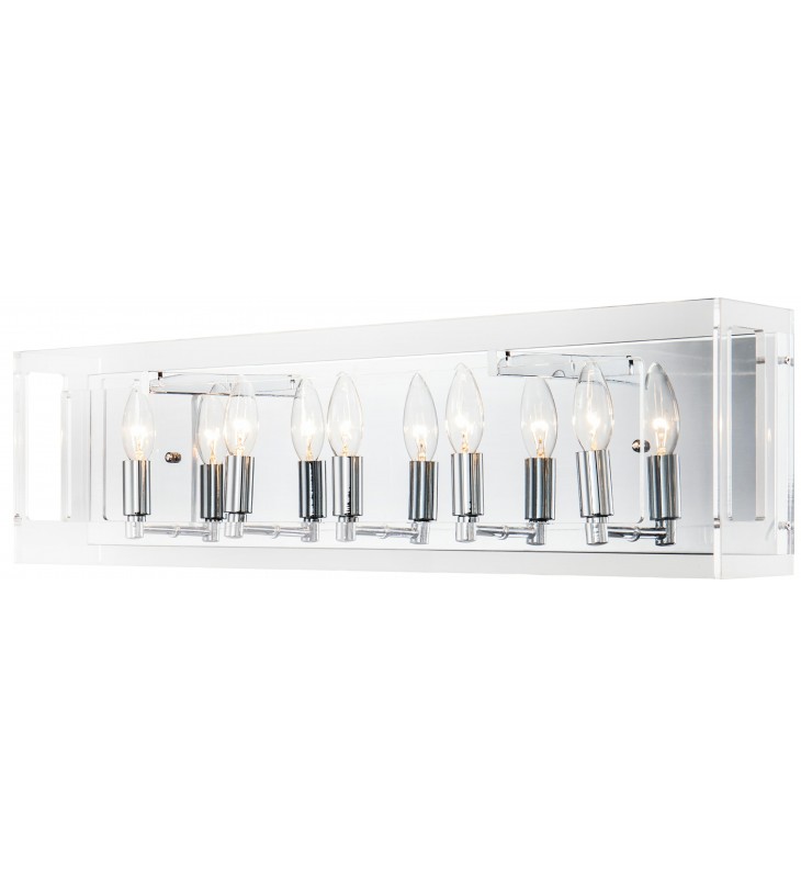 This exquisite wall sconce is in a chrome finish. The frame of the fixture is made out of acrylic and iron. It comes with boxed cut outs, and provides better illumination.