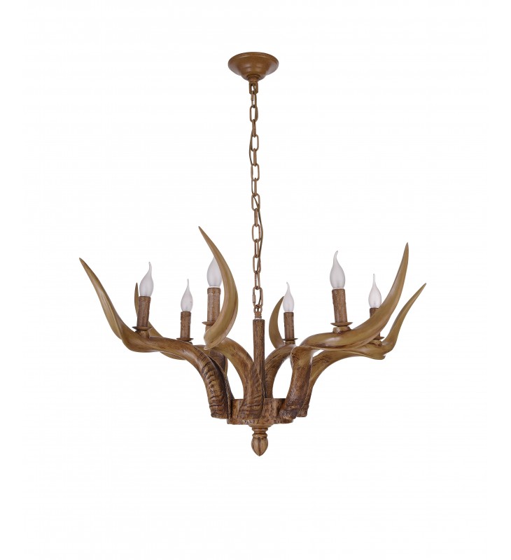 Product Feature : This faux antler chandelier is made out of polyresin and metal This light resembles a realistic antler horn This fixture is hung by a 59" chain that can be adjusted to your liking.