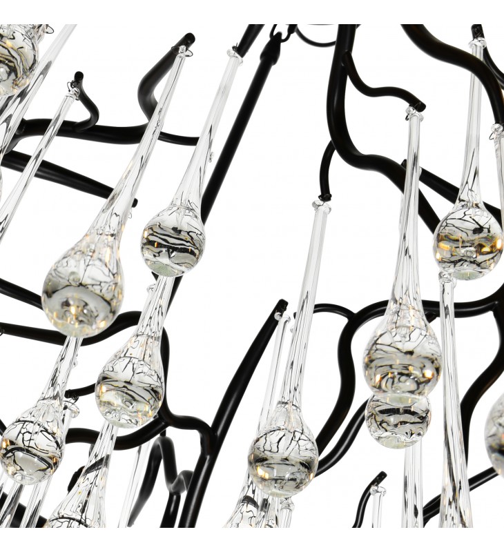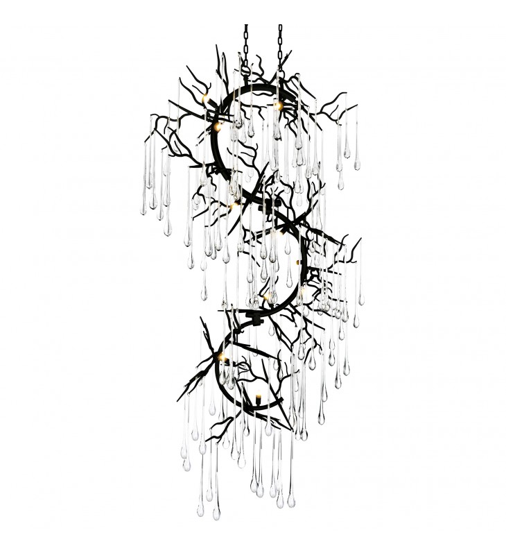 The Anita 12 Light Chandelier in black is flamboyant in every sense of the word. It displays a fascinating look with its curved tree branch-like frame that drips with clear crystal drops. The sculptural pendant measures 60 inches tall and is held by adjustable black chains. Hang this in your stairwell and give a whole new character to your interiors.