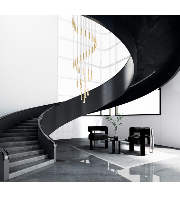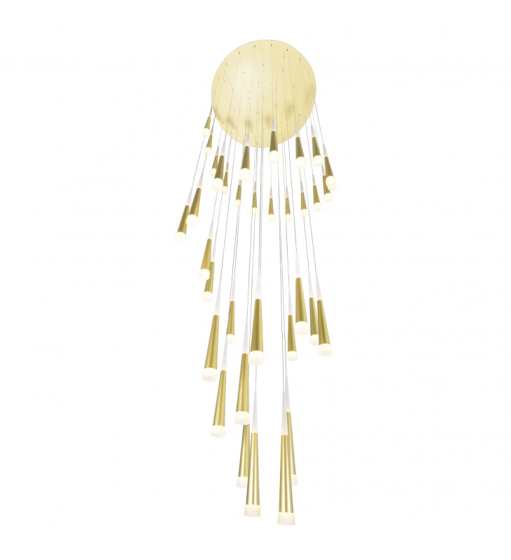 A unique and engaging light fixture featuring 36 conical pendants with integrated LEDs. This Oversized Andes 40 inch LED Chandelier in Satin Gold finish will deliver a dramatic impact to wherever you place it. Stunning in design and impressive in craftsmanship, this fixture is a contemporary illumination your home deserves.