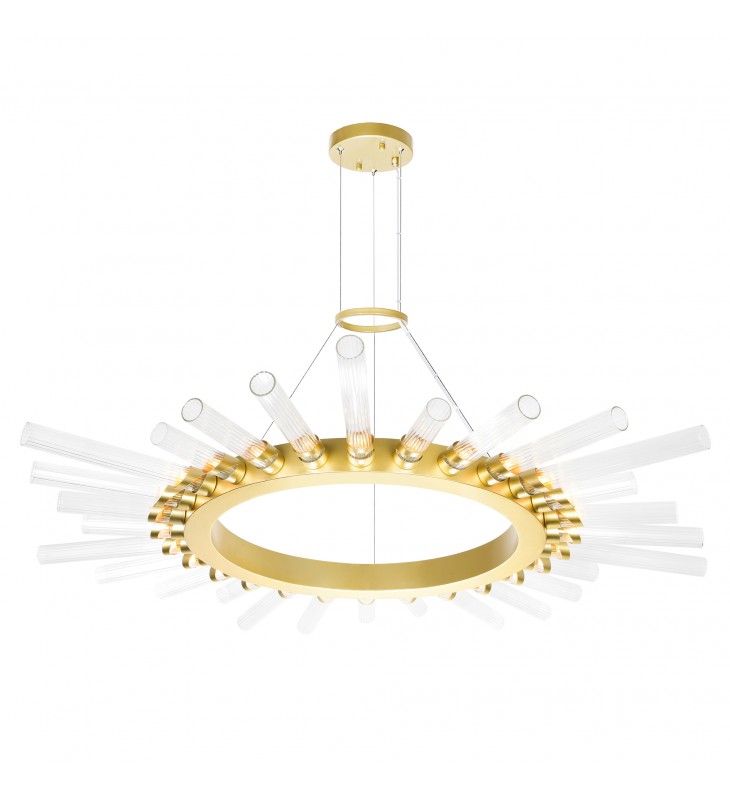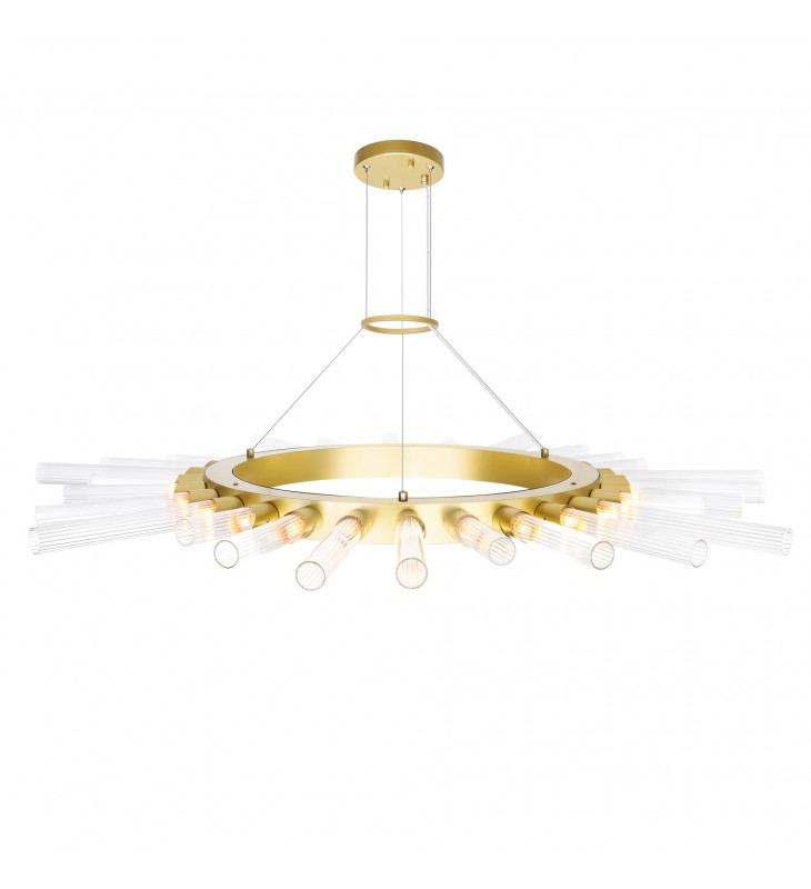 Both edgy and sophisticated, the Collar 28 Light Chandelier has the functionality and style presence that can benefit any setting. It features a satin gold circular metal band measuring 28 inches in diameter. Around it are cylindrical tube glasses serving as shades that diffuse light throughout the space. This modern and futuristic light fixture can bring a designer inchspired touch to any interior.