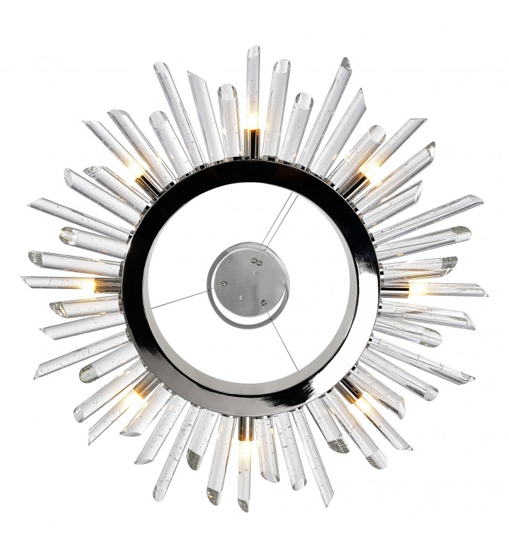 An illumination with an impact, the Thorns 8 Light Chandelier is a sculptural light fixture designed with an aggressive appeal. It features a ring frame in polished nickel wrapped around by thorn-like clear crystal tubes interspersed with eight bi-pin G9 bulbs. The shape and silhouette of this piece will look extremely well in minimalist interiors as well as in modern inchdustrial surroundings.