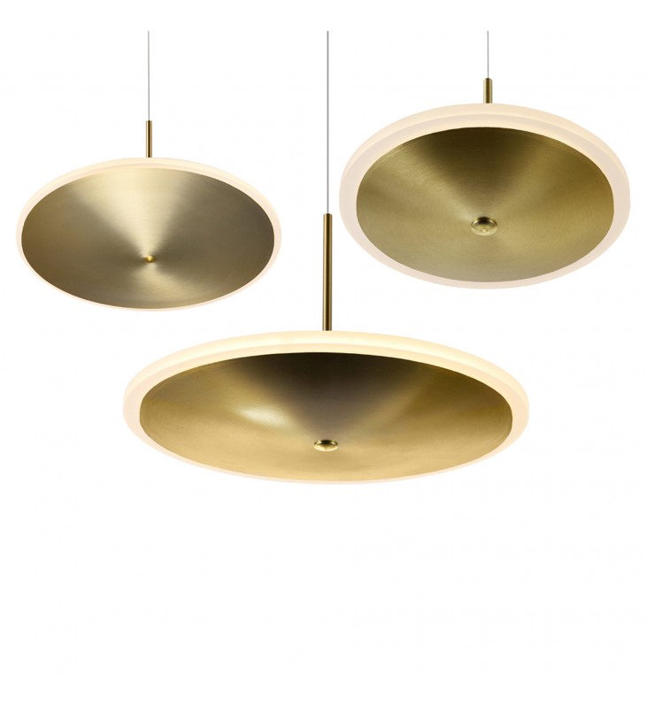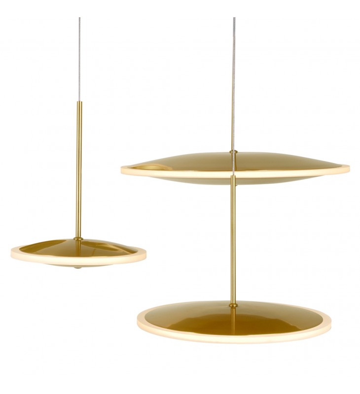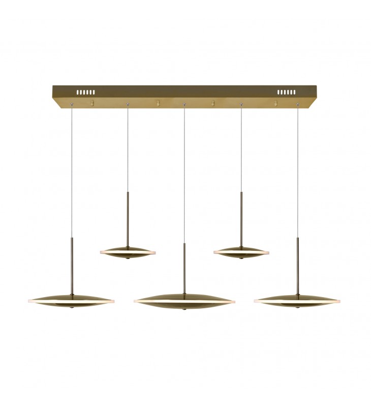 Level up your kitchen\'s sophistication with this Ovni 43 inch LED Island Chandelier in Brass. Five golden discs arranged in alternating heights will bring illumination and a sense of understated luxury to your space. This contemporary light fixture has LED integrated light and a hardwired power source. Crafted in metal and polished in brass finish, expect this piece to give an empty ceiling space a high-class feel.