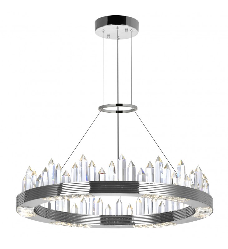 Expect the Agassiz 24 inch LED Chandelier to give a modern and dashing twist to your dining space. This is a transitional up chandelier designed with a textured metal ring frame measuring 24 inches in diameter and finished in polished nickel. Clear crystal towers with integrated LED chips deliver style and illumination. The cord can be adjusted with minimum hanging height of 11 inches and maximum hanging height of 123 inches.