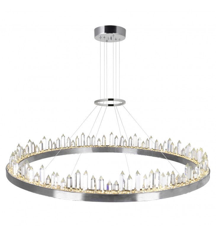The Agassiz 40 inch LED Chandelier displays sculptural artistry and minimalism at the same time. Suspending from a polished nickel canopy is a 40 inch wide ring of the same finish topped with stylish clear crystal spires. Integrated LED chips make this transitional up chandelier shine a soft glow over your living space.