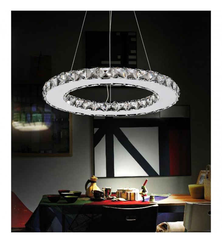 The Ring 16 inch LED Chandelier is a lighting option that will give your space that extra oomph. Measuring 16 inches in diameter and only 1.25 inches in thickness, this streamlined halo chandelier can provide brilliance to a neutral dining room or to a black-and-white kitchen.