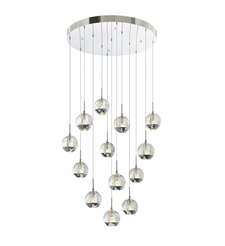 Give your space a soft and subtle display of light through this gorgeous Perrier 13 Light Globe Chandelier. This modern light fixture features a 24 inch circular assembly of thirteen glass balls holding G4 bulbs. Each glass ball has a metal bottom finished in shiny chrome. Creating a floating glass ball effect, this light fixture can adorn any room with beauty, richness, and an opulent glow.