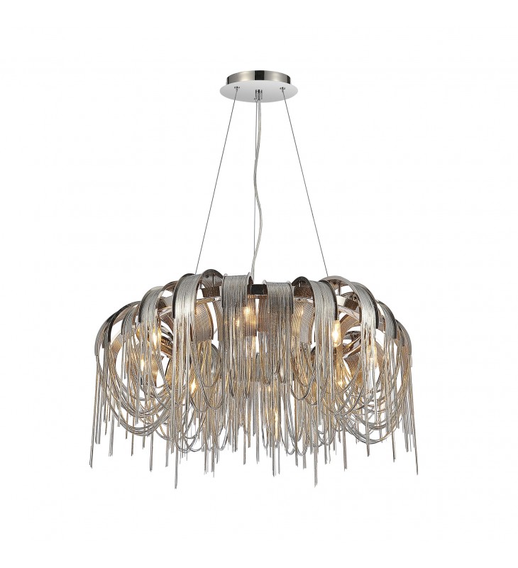 Give your living room, entryway, or dining room a brand new look with just a small change. Replace the light fixture with the \nShirley 8 Light Chandelier. This high-impact light fixture displays a round profile made up of thin metal strands draping beautifully from a chrome-finished metal frame inspired by metal spools. Easily an interesting detail wherever it is placed, this lighting option will add a visual statement and personality to your home.
