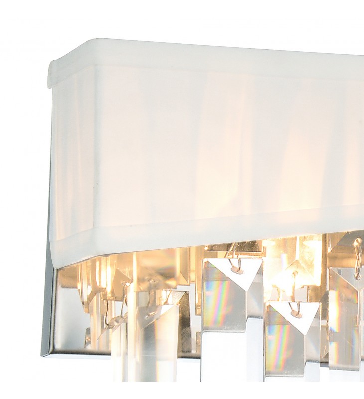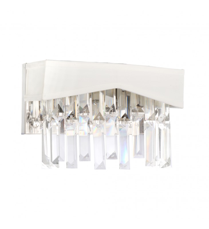 Enliven a dull and dreary room with the Havely 2 Light White Wall Sconce. This light fixture is bound to add drama to a boring space. It comes with a chrome-finished wall plate, a white half-shade, and rectangular crystal accents that make the light glow radiantly. This wall-mounted light fixture will look dashing in any room including the dining room, living room, bedroom, or hallway.
