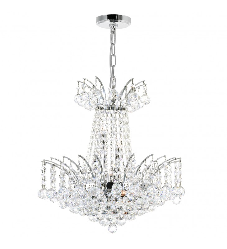 Hang the Posh 11 Light Chandelier in your entryway and never have to worry about making a great first impression. This down chandelier measures 20 inches in diameter and 19 inches in height. It comes with an adjustable chain so you can suspend it according to your preferred height. The elegant silhouette is held by a chrome-finished hardware fully decorated with clear crystals.