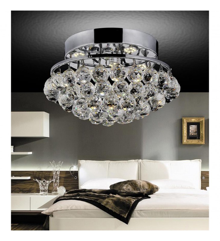 The Round Queen 4 Light Flush Mount is a 14 inch light fixture with a glamorous style. It has a square assembly of dangling round crystals with the chrome-finished metal frame slightly curved for movement and dimension. This lighting option assures you of a regal ambiance perfect for adding a touch of luxury to your interiors.