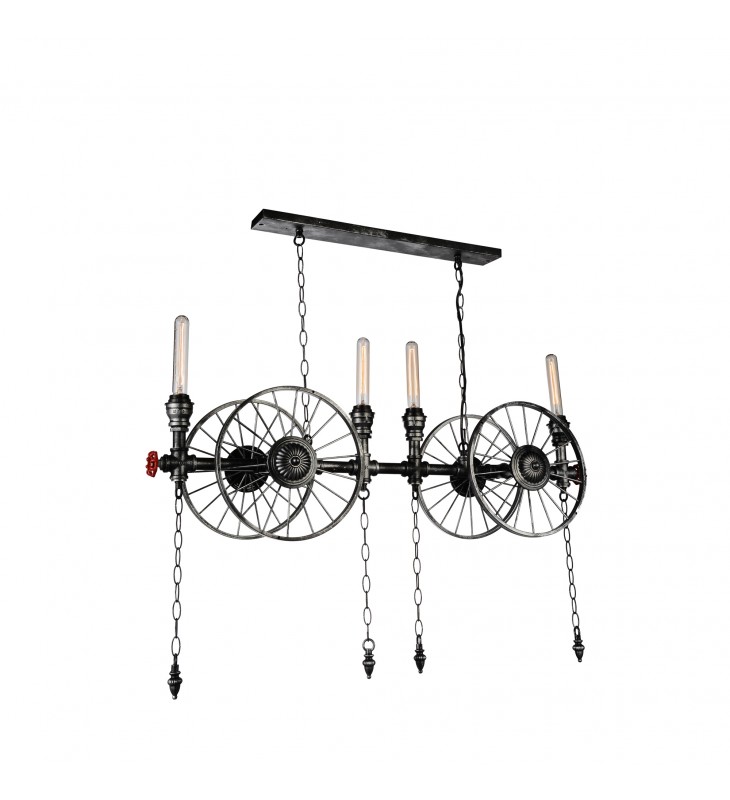Greet guests to your place with this oversized Rio 4 Light Chandelier and take them back to the time when technology changed the way we live. This industrial up chandelier in grey displays tube-shaped bulbs in contrast with circular wheel-like accents on the frame. Inspired by a wagon, this light fixture will make a dramatic statement piece in a high-ceiling space.