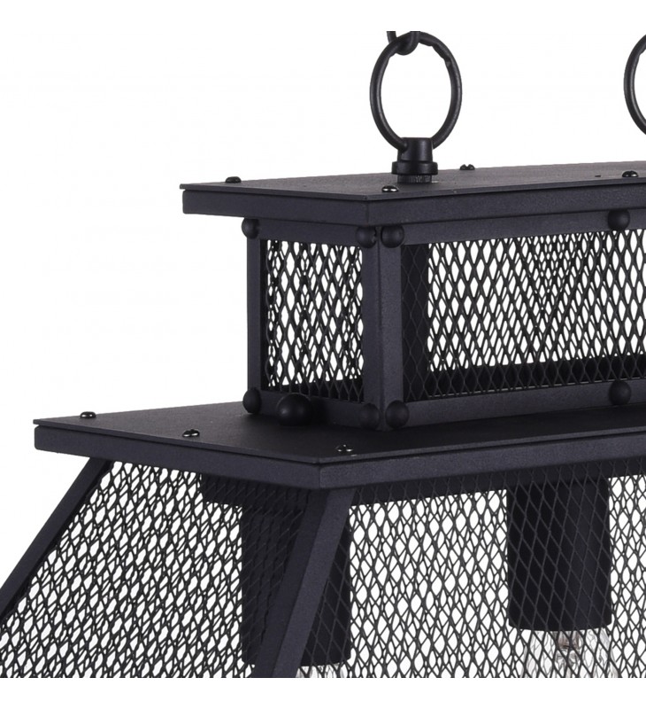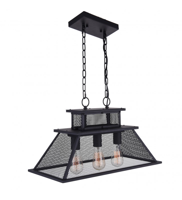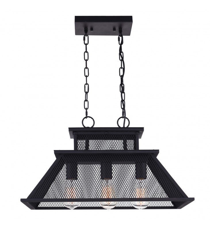 Add farmhouse character to your urban space by adding the Savill 3 Light Chandelier in your kitchen or dining room. This island/pool table light measures 24 inches long and features a metal mesh shade in reddish black finish. The geometric, see-through shade houses three exposed E26 bulbs. The shade hangs from a rectangular canopy with adjustable chain cables.