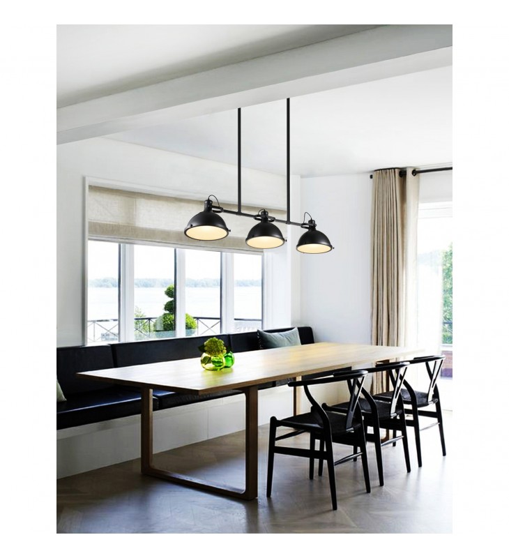 Let your space display your love for the rough-hewn. Get the Strum 3 Light Chandelier for your dining room or kitchen island and let its classic, rustic beauty define your humble abode\'s character. This oversized chandelier measures 50 inches long and features three dome-shaped shades exquisitely crafted in black-finished metal. This light source is guaranteed to add a sense of warmth to your space without a hint of pretension.
