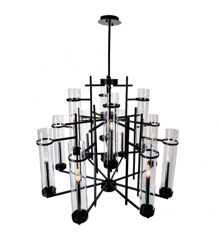 Designed with a dark metal frame balanced by clear cylindrical glass, the Sierra 12 Light Chandelier will bring a striking sculptural detail to your living room, dining room, or foyer. The dynamic silhouette of this oversized 38 inch up chandelier will surely provide your space with great visual appeal. Ample light and warm illumination will be delivered by candelabra bulbs that you can pair with a dimmer switch.