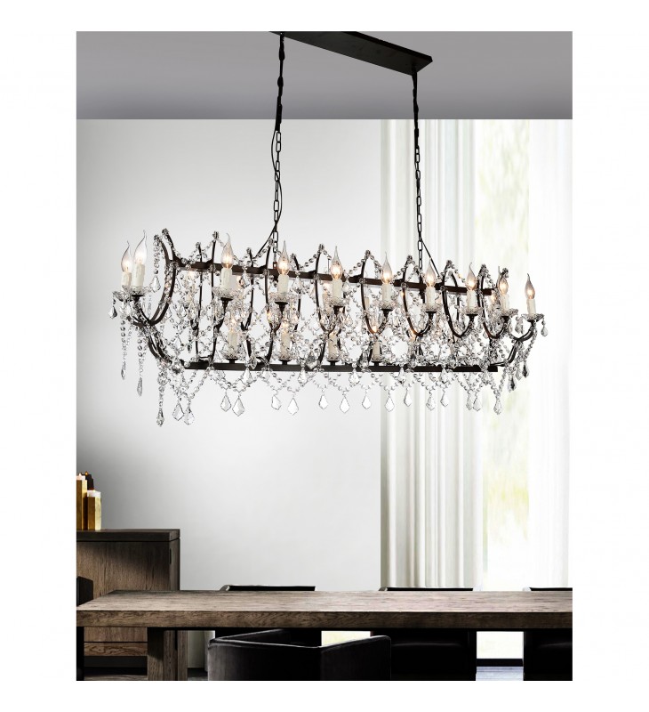 With beauty akin to a glowing goddess, the oversized Phraya 21 Light Up Chandelier shines majestically. One can\'t help but notice its crystal teardrops cascading from a metal frame in a light brown finish. Twenty-one candelabra bulbs add a layer of elegance to this crystal powerhouse.\n