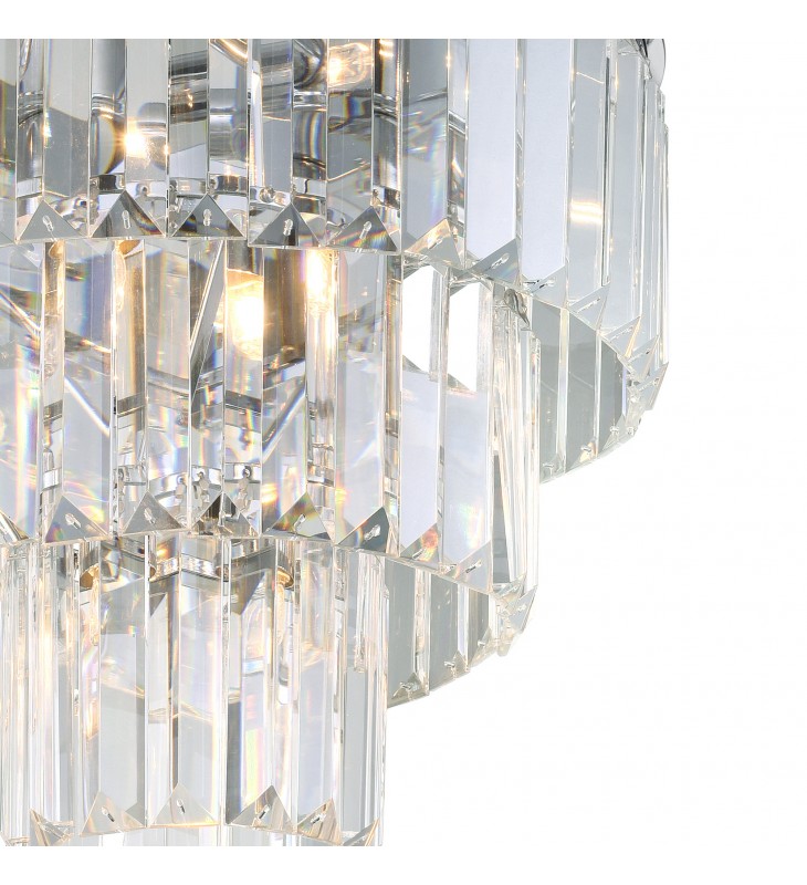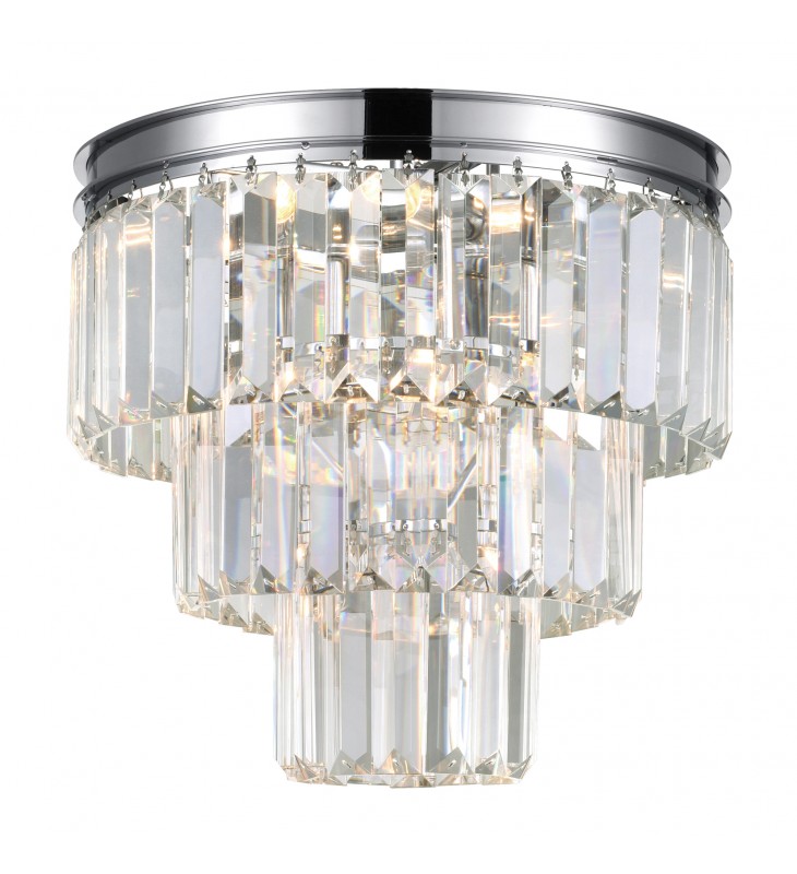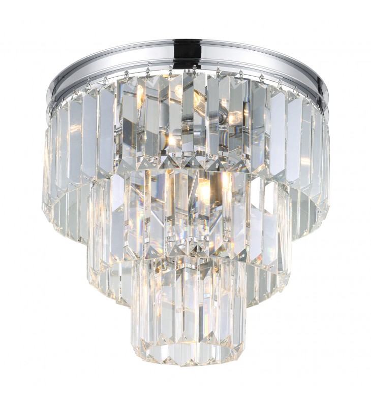 Looking for glam minus the flashy glitz? Then the Weiss 8 Light Flush Mount Chandelier is for you. This lighting fixture is designed with a 12 inch chrome-finished frame holding three tiers of faceted rectangular crystals. This close-to-ceiling lighting option brings in just the right amount of opulence without looking ostentatious and feeling too busy.