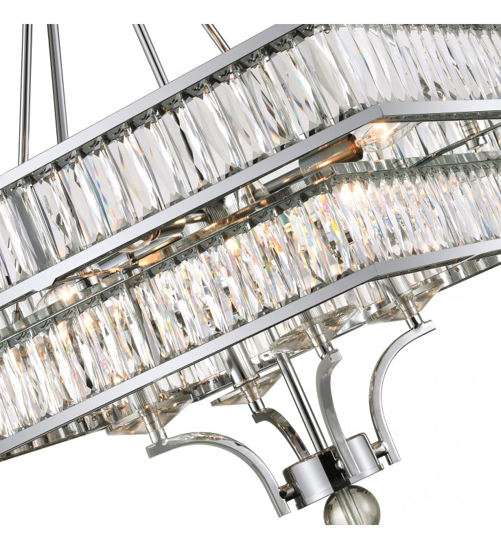 The Shalia 8 Light Chandelier in Chrome is a dazzling square crystal chandelier that can be the focal point of a room. This fixture is equipped with eight candelabra bulbs and a chain cord that you can adjust as you like. Designed with two square bands of faceted crystals and a chrome-finished metal frame, this light source can easily give your space a boost in elegance.