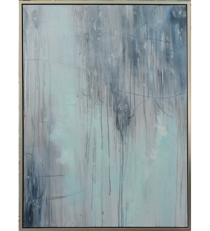 This is an abstract oil painting in blue and white finish. It comes with a frame in silver color