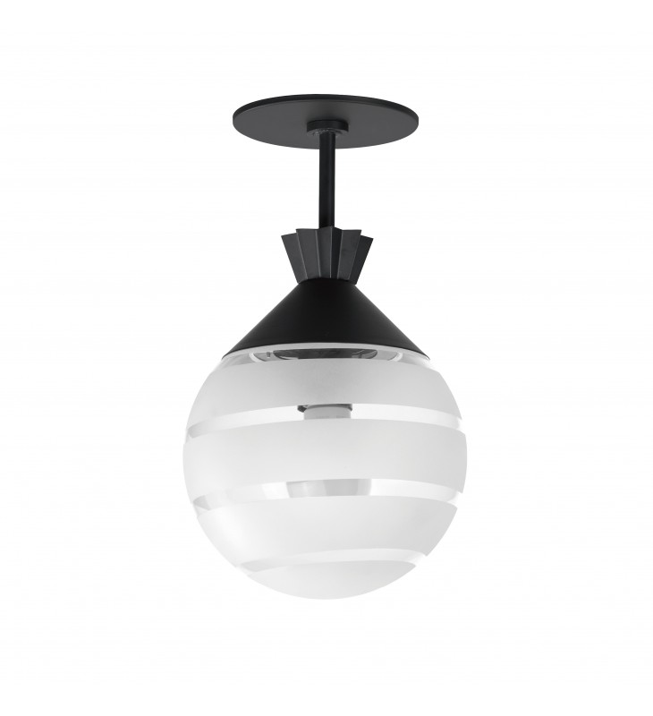 A playful grouping of globe and tapered cylinder glass shades feature a distinctive striped pattern as they are held from crown-like fonts. Spiritedly vintage and excitingly modern, this fashionable series of outdoor rated sconces and pendants connects styles generationally and with renewed imagination. The wide stripes of etched glass are separated with thinner clear glass lines softening the light source in a unique and approachable pattern. The crown tops feature sharply pleated angles that recall the iconic pineapple lanterns, but has updated them with an updated appeal. Sophisticated and full of energy, this design evokes the timeless spirit in Americana tastefully.