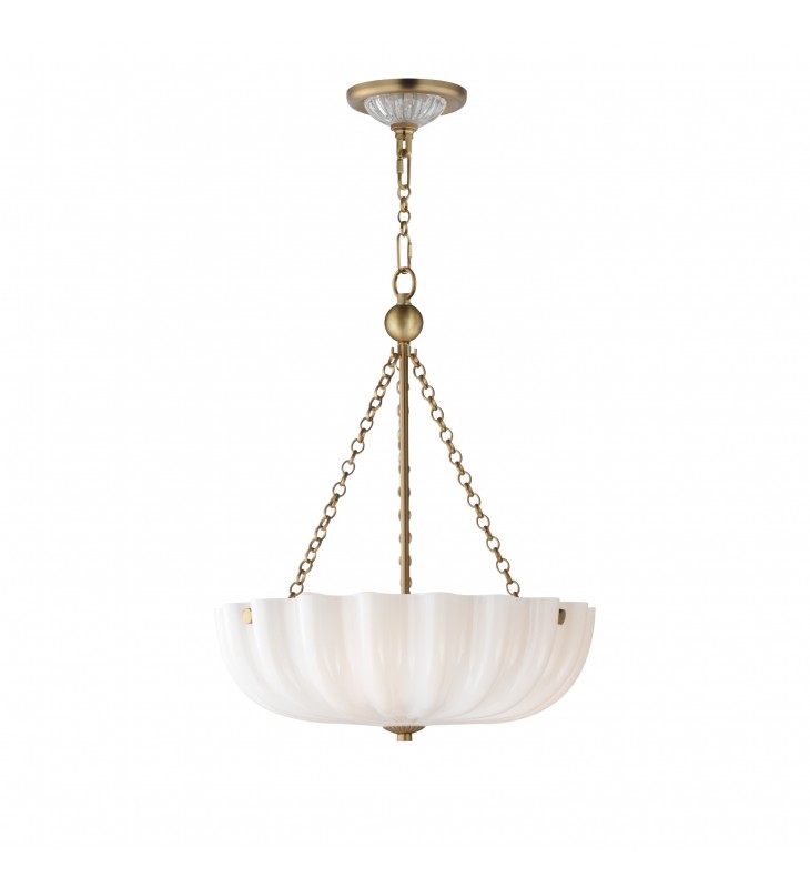 With glossy opal white glass shades, this collection brings a graceful, feminine touch to the inverted bowl design inspired by the shape of a bundt cake. Suspended by a decorative circular ring chain, the shade features an acrylic dust cover that encloses the top, keeping the glass pristine. Finished in Natural Aged Brass, the chain and metalwork complement the timeless elegance of the design, while ribbed glass accents add a distinctive, sophisticated detail to the design.