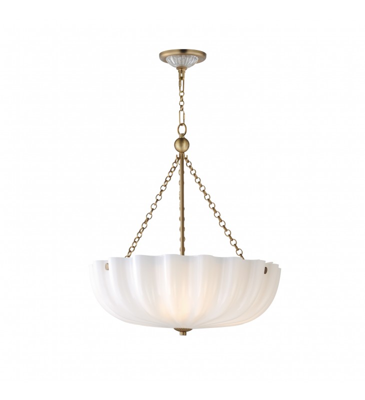 With glossy opal white glass shades, this collection brings a graceful, feminine touch to the inverted bowl design inspired by the shape of a bundt cake. Suspended by a decorative circular ring chain, the shade features an acrylic dust cover that encloses the top, keeping the glass pristine. Finished in Natural Aged Brass, the chain and metalwork complement the timeless elegance of the design, while ribbed glass accents add a distinctive, sophisticated detail to the design.