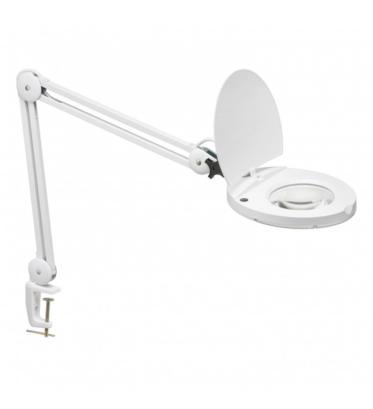 Dainolite Modern Magnifier Table in Painted White Metal for the Table/Desk with 1 bulb, LED socket base 8 Watts max Dimmable and UL Approved for Dry Location with a 3 Years Limited warranty. Great for Specialty, Office, Bedroom rooms and Commercial use. Features include , ,