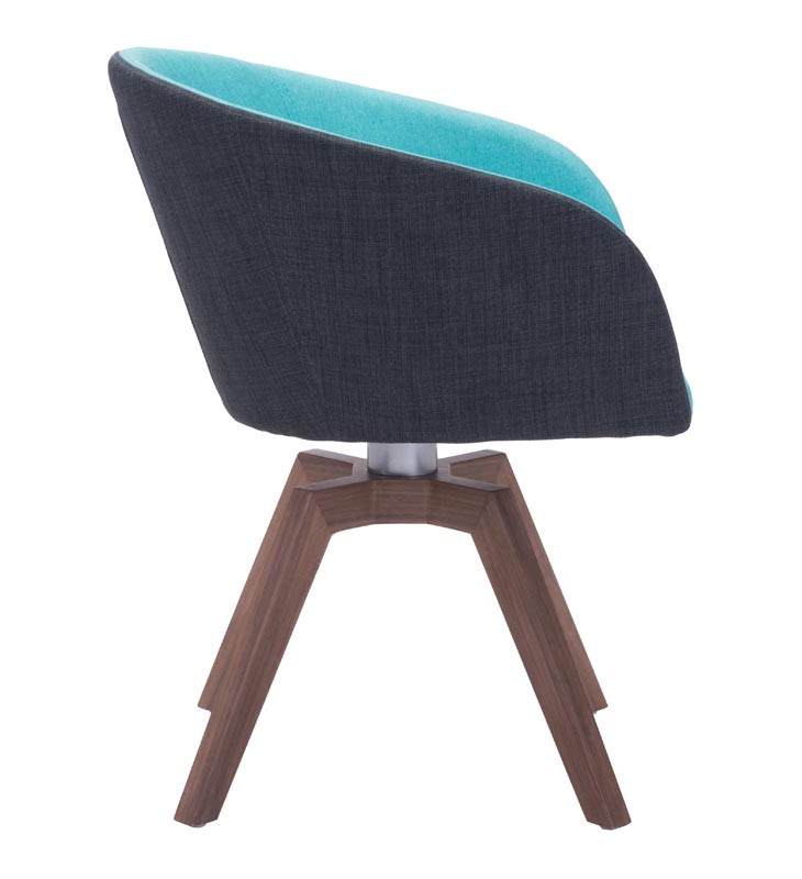 Wander dining chair is petite Mid-Century Modern perfection, as the stunning upholstery in brilliant blue aqua has a poly-silk/velvet feel along inside and rounded inside back creating a modern sculpted cup style; while the outdid back in grey poly-linen fabric are the perfect pairing contrast. While all are superbly supported and finished by sturdy cross style all wood base in warm walnut tone.