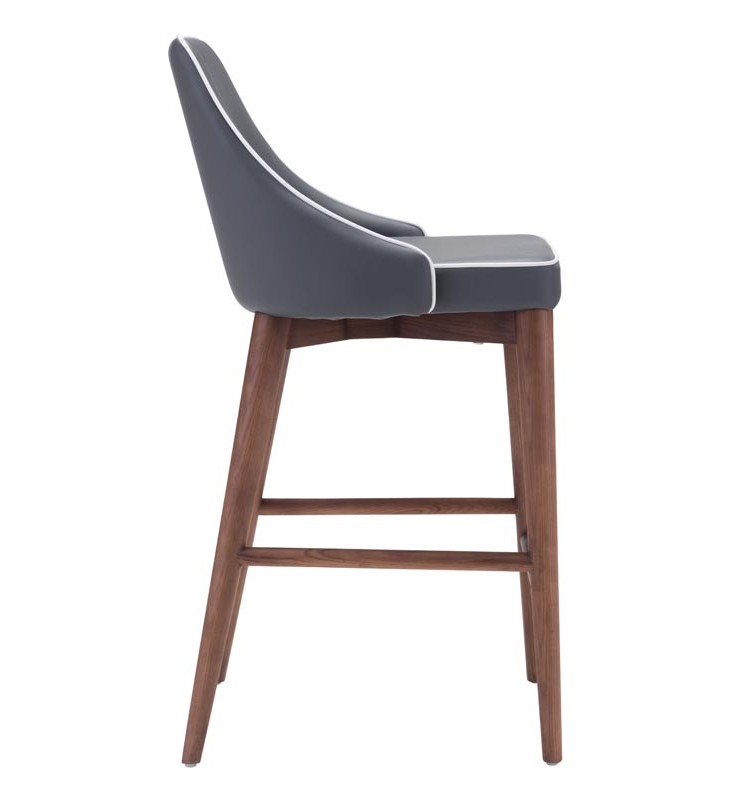Moor counter chair features an exquisite slim wing back style back and plush seat with contrasting accent trim detail and a sturdy all wood base/ footrest in warm walnut finish. Color options soft leatherette in either dark grey or beige with white trim.