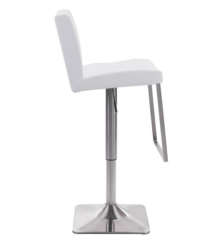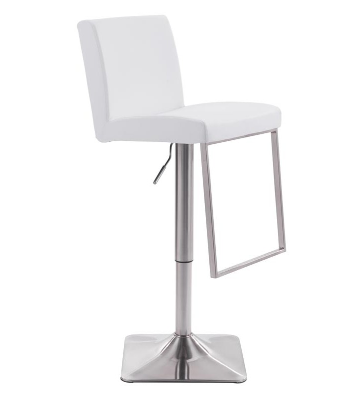 Puma bar chair has a square base chrome with matching column featuring adjustable height for easy bar to counter maneuvering. Plush upholstered soft leatherette are molded finished with slim seams ending in square chrome footrest . Color options are taupe and white leatherette.