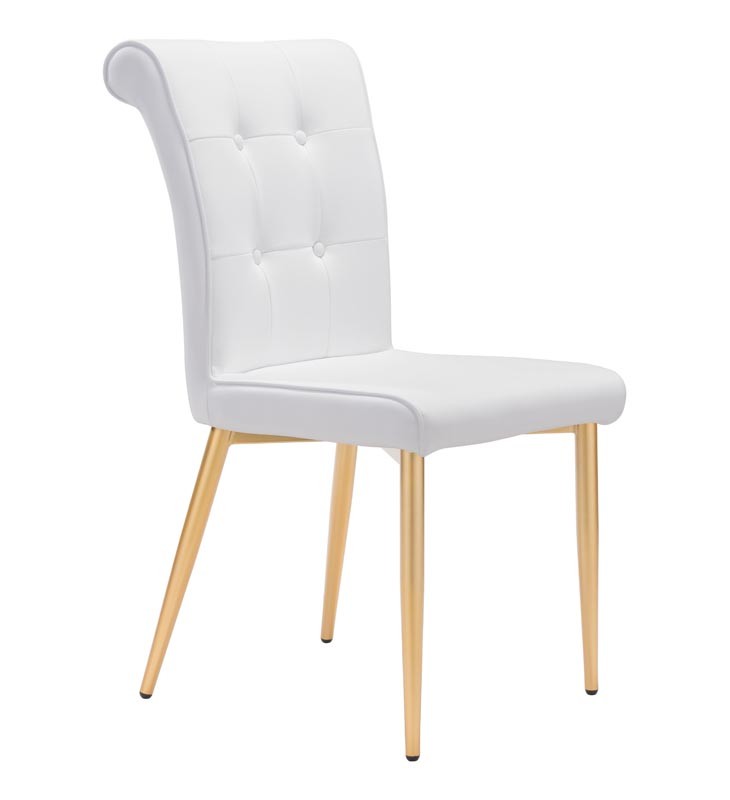 Surround your dining table with luxury. We love this upscale dining chair with its rolled seat back and button tufting. Its brilliant gold base and pencil legs provide strong support. Perfectly pitched for comfort and lingering.