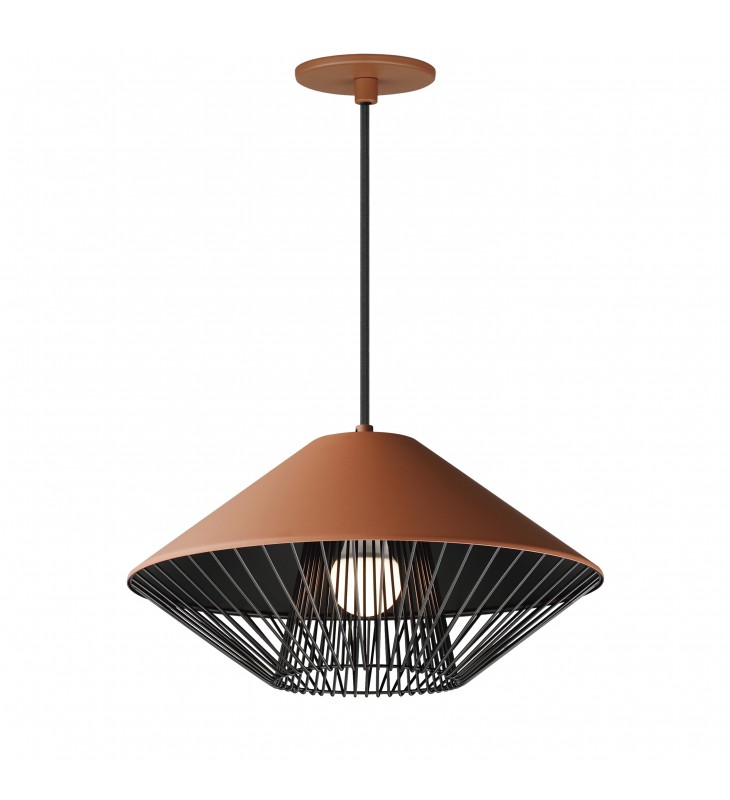 Both modern and industrial, the angular lines of these aluminum spun shades refresh a classic concept in a clean, contemporary execution. The shades - available in Brick, Black, and a Pale Gray powder coated finish, feature multiple joints and peaks in their form and at their bottom intentionally return inward. The shape at the bottom is not only attractive, but a cleverly conceived method to support a wire network of Black steel that forms a cage without visible hardware. Illuminated from within the spun metal shades in 3 varying sizes and shapes, the LED lamp provided shines light below and disperses through the wireway creating a beautiful radiating light pattern.